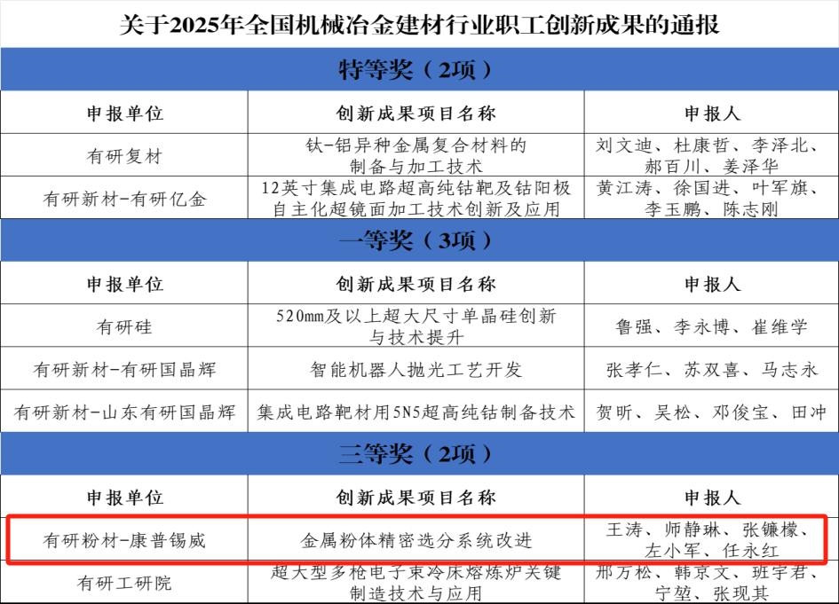 近日,2025年全国机械冶金建材行业职工创新成果评选结果揭晓,亚星游戏官网申报的创新成果《金属粉体精密选分系统改进》荣获三等奖,在守正创新中展现出新作为。